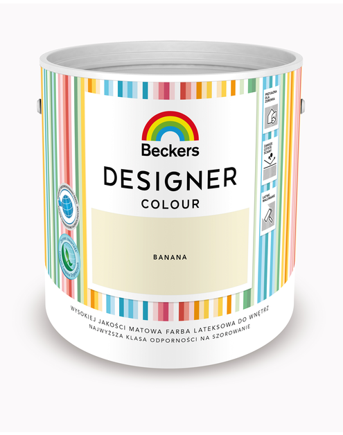 Farba plamoodporna Beckers Designer Colour Banana to wodorozcieńczalny produkt przeznaczony do malowania ścian i sufitów wewnątrz pomieszczeń. Tworzy powłokę o wykończeniu mat, zapewniającą jednolity efekt wizualny. Formuła farby charakteryzuje się wysoką odpornością na szorowanie i otarcia oraz dobrą siłą krycia. Produkt posiada rekomendację Polskiego Towarzystwa Alergologicznego.