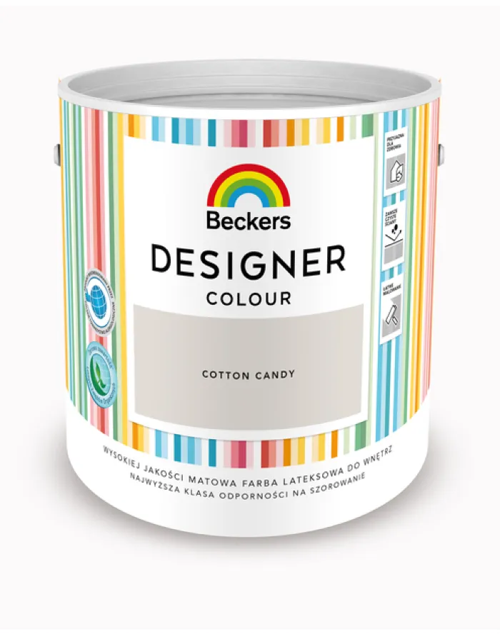 Farba plamoodporna Beckers Designer Colour Cotton Candy to wodorozcieńczalny produkt przeznaczony do malowania ścian i sufitów wewnątrz pomieszczeń. Tworzy powłokę o wykończeniu mat, zapewniającą jednolity efekt wizualny. Formuła farby charakteryzuje się wysoką odpornością na szorowanie i otarcia oraz dobrą siłą krycia. Produkt posiada rekomendację Polskiego Towarzystwa Alergologicznego.