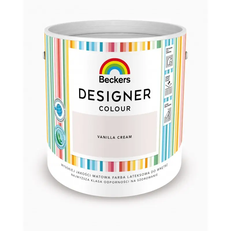 Farba plamoodporna Beckers Designer Colour Vanilla Cream to wodorozcieńczalny produkt przeznaczony do malowania ścian i sufitów wewnątrz pomieszczeń. Tworzy powłokę o wykończeniu mat, zapewniającą jednolity efekt wizualny. Formuła farby charakteryzuje się wysoką odpornością na szorowanie i otarcia oraz dobrą siłą krycia. Produkt posiada rekomendację Polskiego Towarzystwa Alergologicznego.