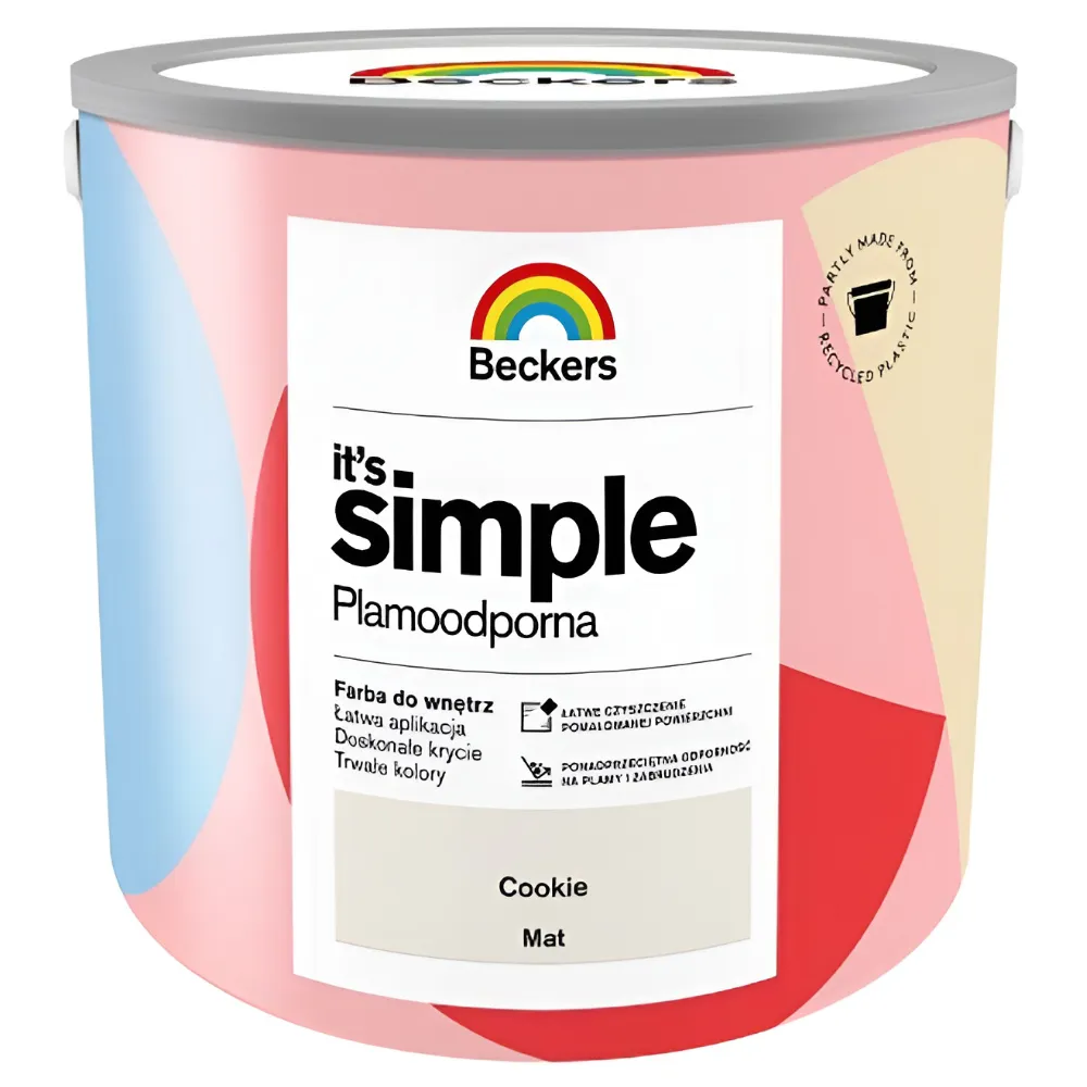 Beckers It's Simple to wodorozcieńczalna farba lateksowa przeznaczona do malowania ścian i sufitów wewnątrz pomieszczeń. Tworzy plamoodporną i hydrofobową powłokę o podwyższonej odporności na szorowanie i zmywanie. Produkt zapewnia dobre krycie oraz trwały efekt plamoodporności w pomieszczeniach narażonych na zabrudzenia.