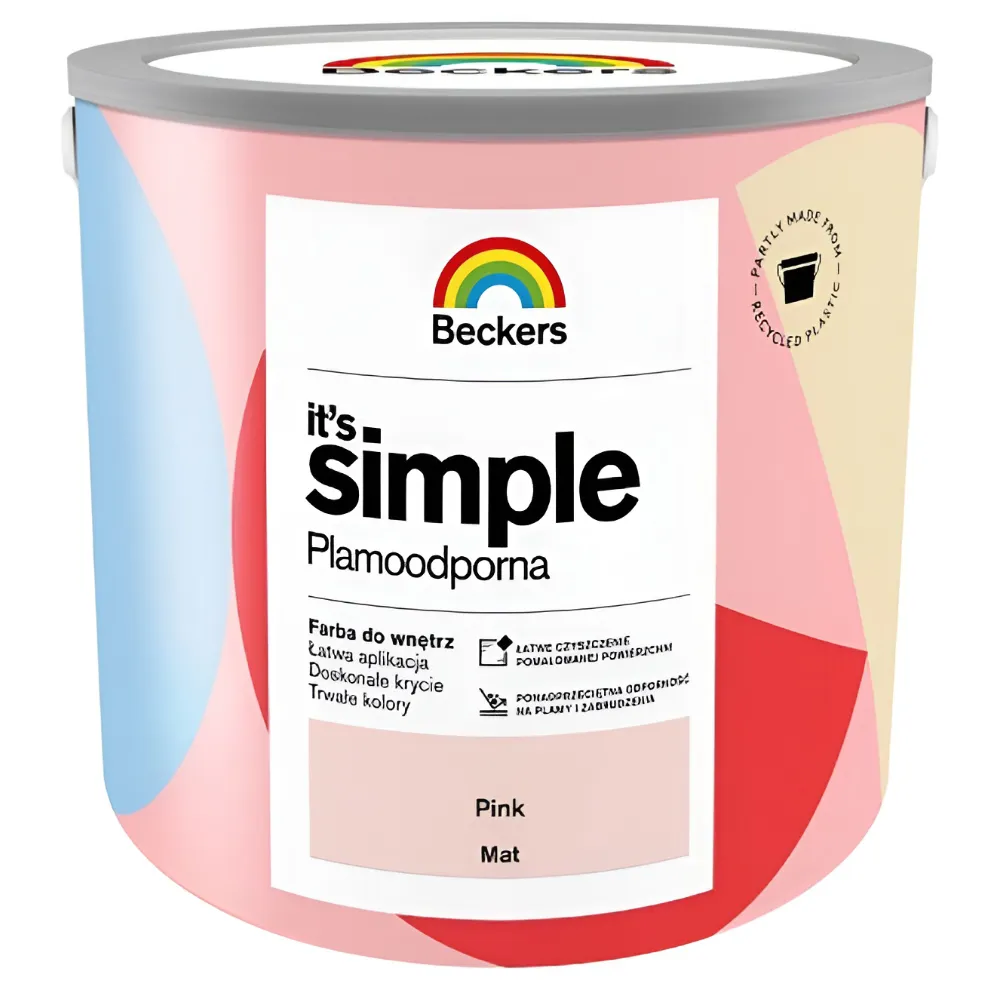 Beckers It's Simple to wodorozcieńczalna farba lateksowa przeznaczona do malowania ścian i sufitów wewnątrz pomieszczeń. Tworzy plamoodporną i hydrofobową powłokę o podwyższonej odporności na szorowanie i zmywanie. Produkt zapewnia dobre krycie oraz trwały efekt plamoodporności w pomieszczeniach narażonych na zabrudzenia.