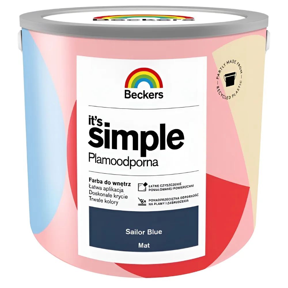 Beckers It's Simple to wodorozcieńczalna farba lateksowa przeznaczona do malowania ścian i sufitów wewnątrz pomieszczeń. Tworzy plamoodporną i hydrofobową powłokę o podwyższonej odporności na szorowanie i zmywanie. Produkt zapewnia dobre krycie oraz trwały efekt plamoodporności w pomieszczeniach narażonych na zabrudzenia.