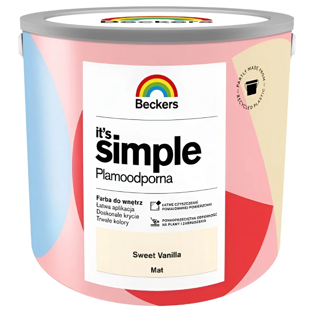 Beckers It's Simple to wodorozcieńczalna farba lateksowa przeznaczona do malowania ścian i sufitów wewnątrz pomieszczeń. Tworzy plamoodporną i hydrofobową powłokę o podwyższonej odporności na szorowanie i zmywanie. Produkt zapewnia dobre krycie oraz trwały efekt plamoodporności w pomieszczeniach narażonych na zabrudzenia.