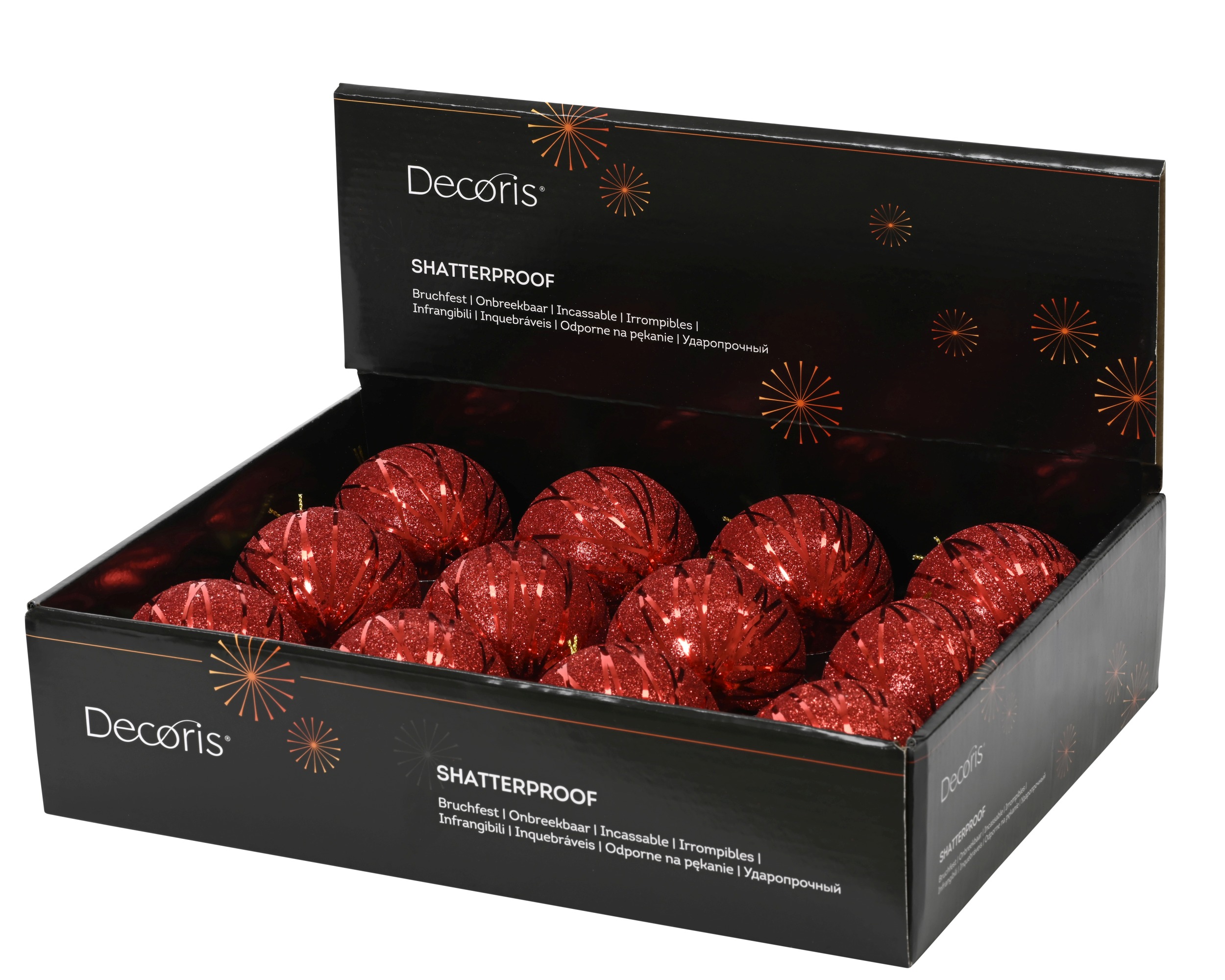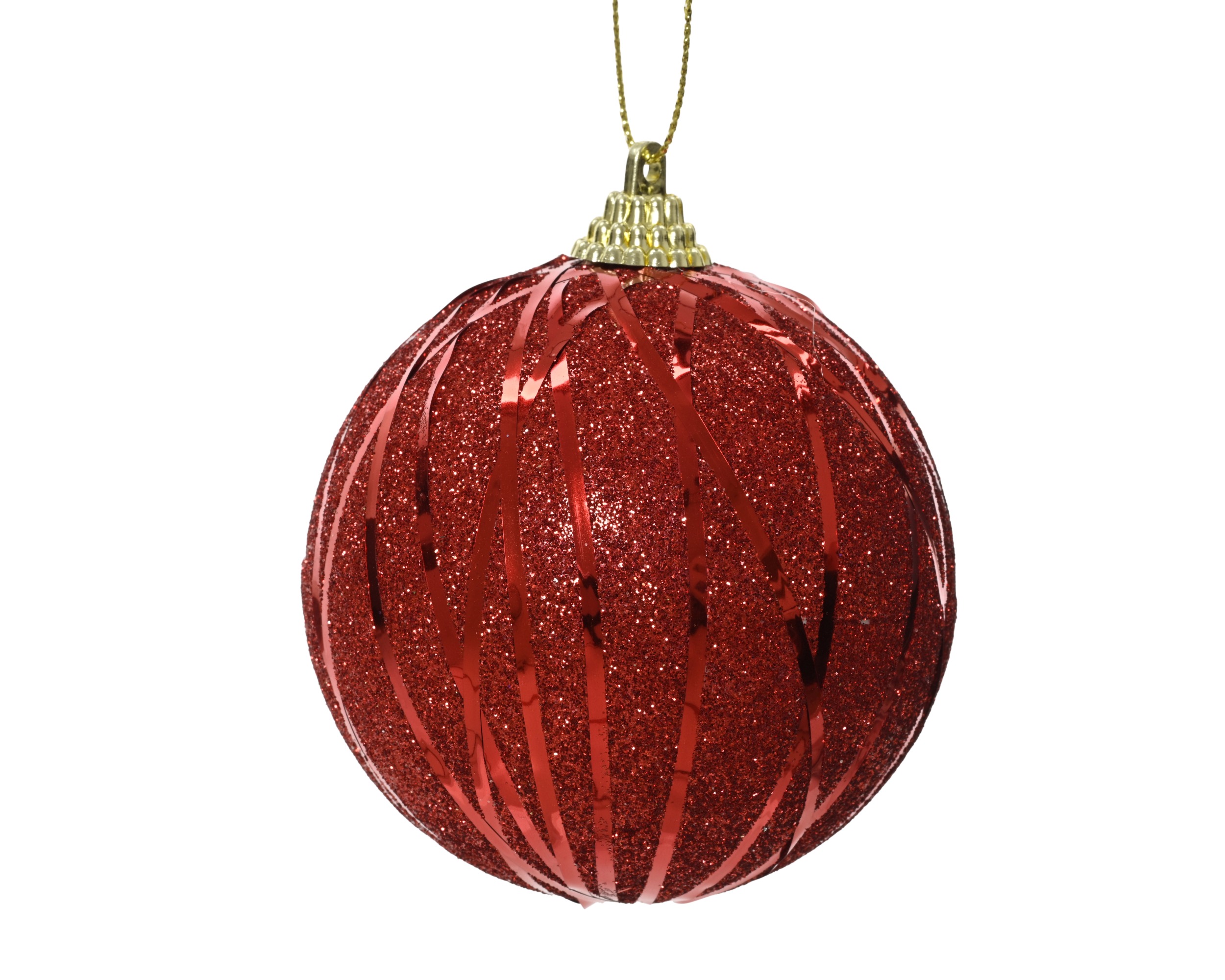 Bombka dekoracyjna wykonana z lekkiego tworzywa przeznaczona jest do świątecznych dekoracji drzewka, stroików i ekspozycji sezonowych. Czerwony kolor w tonacji świątecznej został uzupełniony warstwą brokatu oraz cekinami, które nadają ozdobie połysk i efekt strukturalny. Górna część bombki wyposażona jest w złotą plastikową czapkę oraz złoty drut pełniący funkcję zawieszki, co ułatwia montaż na gałązkach lub haczykach dekoracyjnych.