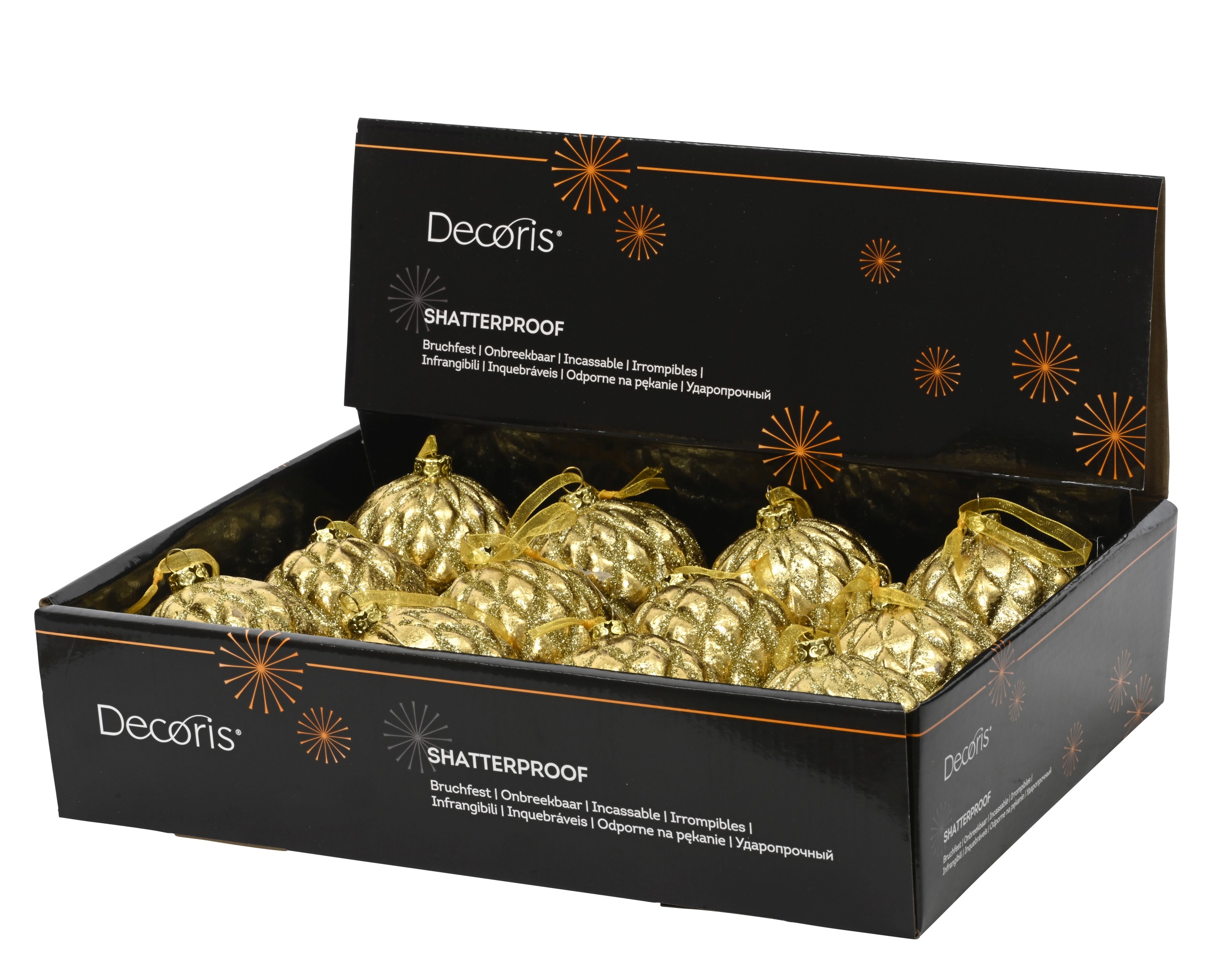 Bombka świąteczna o średnicy 8 cm wykonana z lekkiego, nietłukącego tworzywa i pokryta brokatem w odcieniu jasnozłotym. Ozdoba wyposażona jest w złotą wstążkę z organzy, która umożliwia łatwe i stabilne zawieszenie na choince lub innych dekoracjach świątecznych. Niska waga sprawia, że bombka dobrze nadaje się do montażu na delikatnych gałązkach.
