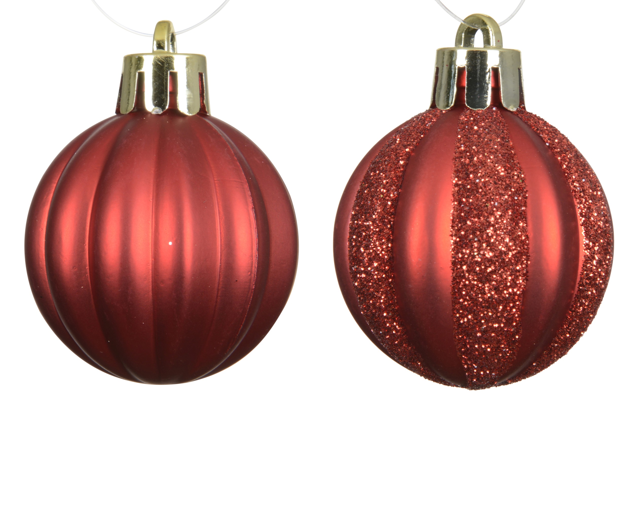 Bombki z polistyrenu matowe z brokatem w kolorze czerwonym świątecznym to lekkie i odporne na stłuczenie ozdoby choinkowe o wymiarach 11,4 × 7,6 × 15 cm. Brokat w odcieniu dopasowanym do koloru bombki tworzy spójną i elegancką dekorację. Zestaw 24 sztuk zapakowano w przezroczysty transbox PET.
