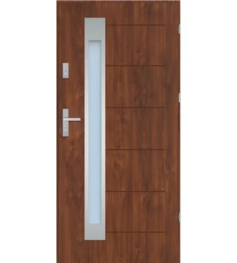 - wyposażenie: w zestawie ciepła ościeżnica drewniano-stalowa z rdzeniem z drewna klejonego, próg termiczny aluminiowy z uszczelką i blokerem izolacyjnym, klamka zestaw okuć AXA HAGA ++ INOX ( szyld dolny klamki z wkładką z kluczami + szyld górny z wkładko-gałką z kluczami )
