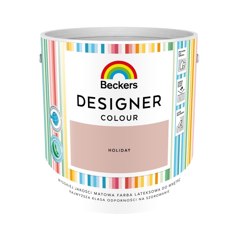 Farba plamoodporna Beckers Designer Colour Holiday to wodorozcieńczalny produkt przeznaczony do malowania ścian i sufitów wewnątrz pomieszczeń. Tworzy powłokę o wykończeniu mat, zapewniającą jednolity efekt wizualny. Formuła farby charakteryzuje się wysoką odpornością na szorowanie i otarcia oraz dobrą siłą krycia. Produkt posiada rekomendację Polskiego Towarzystwa Alergologicznego.
