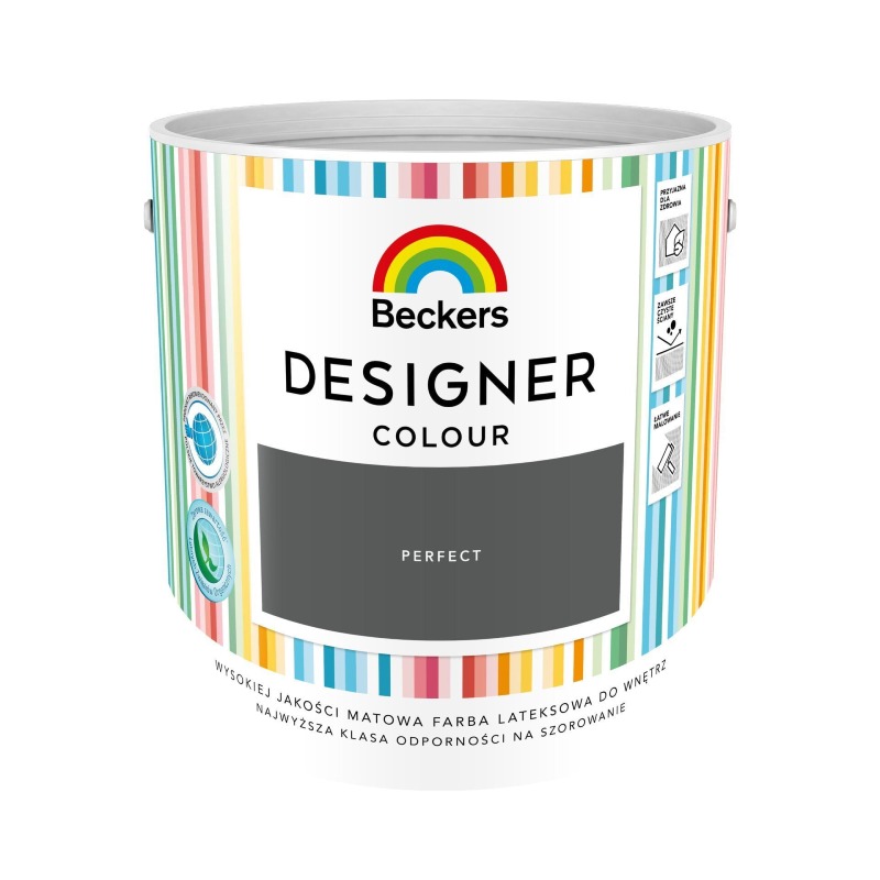 Farba plamoodporna Beckers Designer Colour Perfect to wodorozcieńczalny produkt przeznaczony do malowania ścian i sufitów wewnątrz pomieszczeń. Tworzy powłokę o wykończeniu mat, zapewniającą jednolity efekt wizualny. Formuła farby charakteryzuje się wysoką odpornością na szorowanie i otarcia oraz dobrą siłą krycia. Produkt posiada rekomendację Polskiego Towarzystwa Alergologicznego.