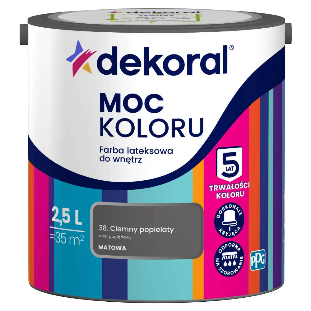 Farba lateksowa Dekoral Moc Koloru Ciemny Popielaty 2,5L przeznaczona jest do dekoracyjnego malowania ścian i sufitów wewnątrz pomieszczeń. Odcień inspirowany naturalnym kamieniem nadaje wnętrzom elegancki, stonowany charakter, dobrze komponujący się z nowoczesnymi i klasycznymi aranżacjami. Farba zapewnia bardzo dobre krycie oraz łatwą aplikację.