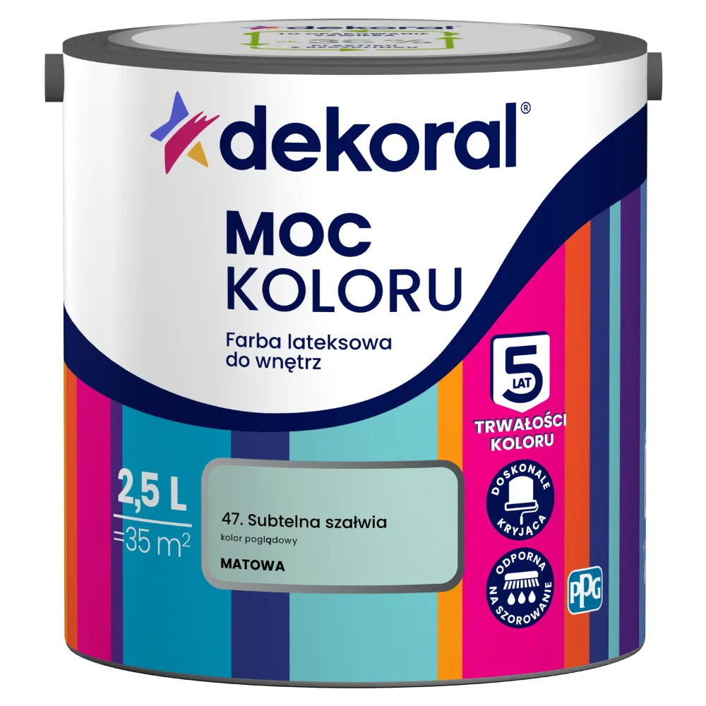 Farba lateksowa Dekoral Moc Koloru Subtelna Szałwia 2,5L przeznaczona jest do dekoracyjnego malowania ścian i sufitów wewnątrz pomieszczeń. Odcień inspirowany naturalnym kamieniem nadaje wnętrzom elegancki, stonowany charakter, dobrze komponujący się z nowoczesnymi i klasycznymi aranżacjami. Farba zapewnia bardzo dobre krycie oraz łatwą aplikację.