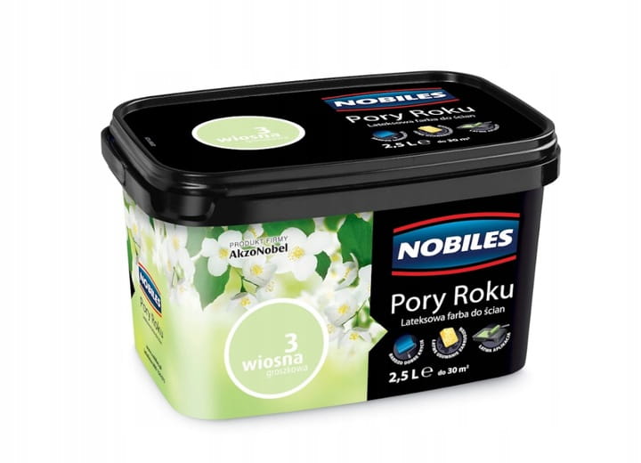 Nobiles Pory Roku lateksowa farba do ścian to kolekcja matowych farb dostępnych w innowacyjnych gamach kolorystycznych, przeznaczonych do dekoracyjnego malowania ścian i sufitów wewnątrz pomieszczeń. Farby z kolekcji Pory Roku tworzą powłoki o wysokich walorach dekoracyjnych, charakteryzujących się doskonałym kryciem, trwałością i czystością barw. Dzięki mikroporowatej strukturze umożliwiają oddychanie ścian. Farby Pory Roku zalecane są do podłoży cementowo-wapiennych, betonowych, gipsowych i kartonowo- gipsowych, również wcześniej malowanych farbami emulsyjnymi. Można zmywać z nich lekkie zabrudzenia.