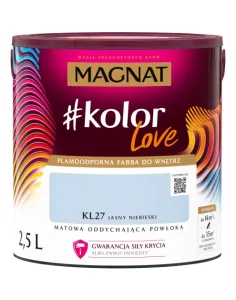 Farba lateksowa z serii kolorLove marki Magnat przeznaczona jest do malowania ścian i sufitów wewnątrz pomieszczeń. Tworzy matową, paroprzepuszczalną powłokę, która wspiera prawidłową wymianę powietrza między podłożem a otoczeniem. Produkt charakteryzuje się równomiernym kryciem, głębią koloru oraz niską zawartością lotnych związków organicznych. Odcień jasny niebieski pozwala uzyskać lekką i harmonijną kolorystykę we wnętrzach mieszkalnych.