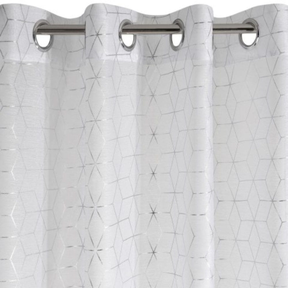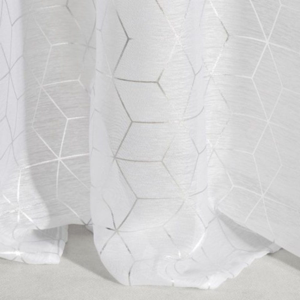 Zwiewna firana o minimalistycznym charakterze. Biała dekoracja ze srebrnym nadrukiem o geometrycznym wzorze rombów doskonale sprawdzi się w roli zasłony. Firana po powieszeniu układa się w regularne fale, dzięki czemu zawsze będzie nadawała estetyki wnętrzu. Przelotki służą odpowiedniemu układaniu się tkaniny na oknie, dzięki nim masz kontrolę nad szerokością na jakiej zasłona ma zakrywać okno bądź ścianę. Pozwalają także na sprawne ściąganie oraz zakładanie dekoracji.