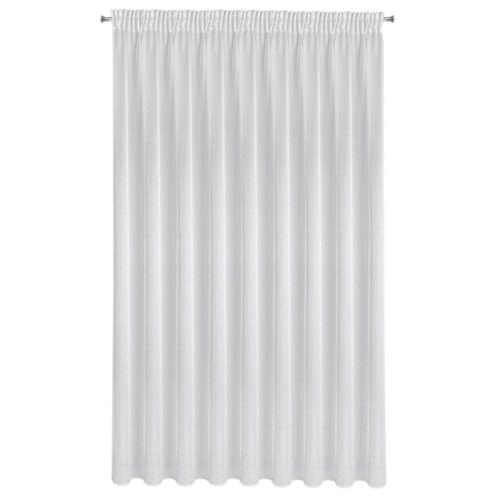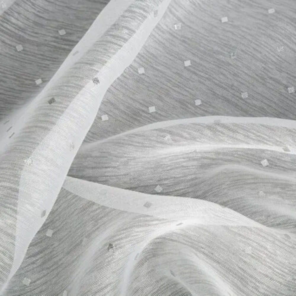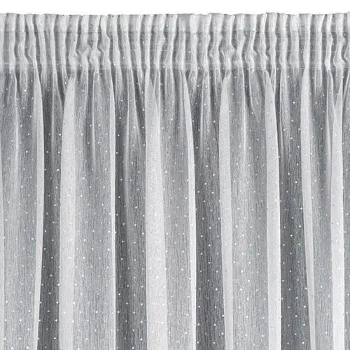 Firanę Sibel z delikatnej białej tkaniny przyozdabia delikatny srebrzysty nadruk w postaci równomiernie rozmieszczonych kwadracików. Półtransparentna tkanina chroni przed nadmiarem słonecznych promieni, zapewniając jednocześnie doświetlenie wnętrza naturalnym światłem. Firana jest uszyta na taśmie marszczącej, dzięki czemu tkanina zjawiskowo się prezentuje po zawieszeniu na karniszu a zwiewna i lekka dzianina z użytecznego poliestru daje efekt łagodnych fal, miękko spływających z karnisza.