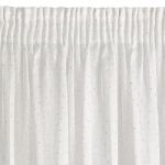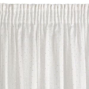 Firanę Sibel z delikatnej białej tkaniny przyozdabia delikatny nadruk w kolorze szampańskim w postaci równomiernie rozmieszczonych kwadracików. Półtransparentna tkanina chroni przed nadmiarem słonecznych promieni, zapewniając jednocześnie doświetlenie wnętrza naturalnym światłem .Firana jest uszyta na taśmie dzięki czemu tkanina zjawiskowo się prezentuje po zawieszeniu na karniszu a zwiewna i lekka dzianina z użytecznego poliestru daje efekt łagodnych fal, miękko spływających z karnisza