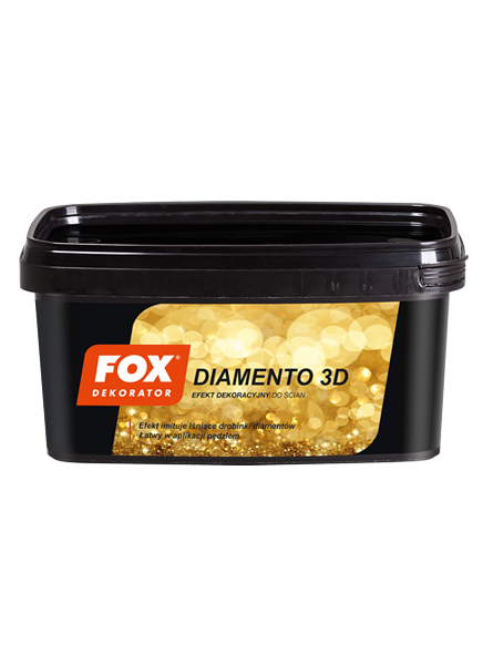 Farba dekoracyjna Fox Diamento 3D przeznaczona jest do wykonywania efektownych dekoracji ścian wewnętrznych. Produkt tworzy powłokę z delikatną strukturą przestrzenną, w której widoczne są drobne, połyskujące elementy przypominające lśniące drobinki diamentów.