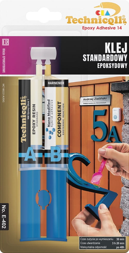 Standardowy Klej Epoksydowy o wydłużonym czasie sieciowania. Stosowany do trwałego łączenia: szkła, porcelany, ceramiki, tworzyw sztucznych (za wyjątkiem PP, PE, PTFE), kamienia, betonu, marmuru, metali i ich stopów, gumy, drewna. Doskonały do zalewania elementów elektronicznych. Może być stosowany jako kotwa chemiczna.