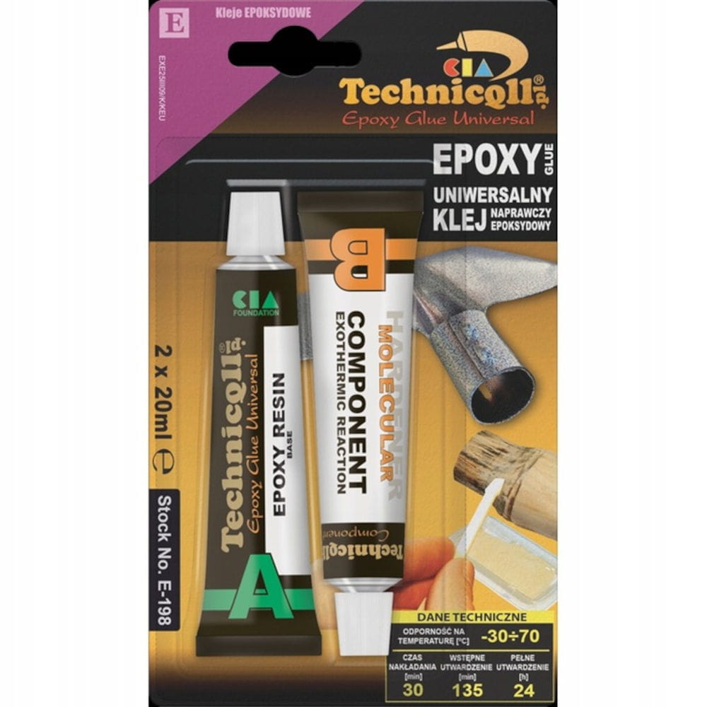 Wysokiej jakości uniwersalny klej dwuskładnikowy dający niespotykaną trwałość łączonych spoin. Stosowany do wszystkich materiałów używanych w technice, przemyśle i gospodarstwie domowym. Łączy trwałą spoiną szkło, metale, drewno, kamień, porcelanę, styropian, marmur, ebonit, fajans, twarde tworzywa sztuczne (z wyjątkiem PP, PE, PTFE i gumy silikonowej). Doskonale klei również kombinacje materiałowe np. szkło - metal, plastik - drewno. Spoiny charakteryzują się wysoką wytrzymałością i elastycznością przy zachowaniu twardości, dzięki czemu mogą być stosowane do łączenia materiałów o różnej rozszerzalności, eksploatowanych w ekstremalnych warunkach atmosferycznych. Chroni przed korozją.