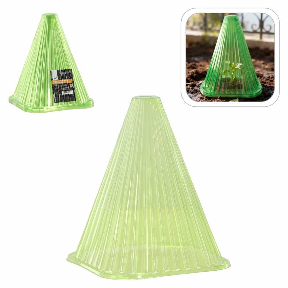 Zestaw kloszy ochronnych Garden Line przeznaczony jest do zabezpieczania młodych roślin i sadzonek przed niekorzystnymi warunkami atmosferycznymi. Każdy element ma wymiary 19 x 19 x 21 cm oraz stożkową konstrukcję z pionowymi przetłoczeniami zwiększającymi sztywność. Wykonanie z tworzywa sztucznego umożliwia wielokrotne użytkowanie w sezonie ogrodniczym.