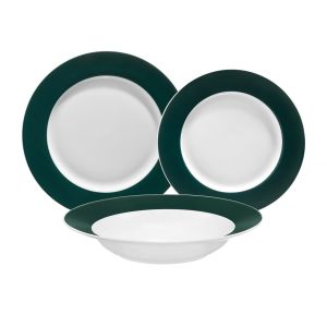 Komplet obiadowy talerzy z serii Aura Green marki Ambition. Wykonany z wysokiej jakości białej porcelany New Bone China. Pięknie zaprezentuje przyrządzone przez nas dania na uroczystym, świątecznym stole. Pochodzi z ponadczasowej kolekcji Aura o klasycznym okrągłym kształcie. Aura Green dodatkowo została ozdobiona wyrazistym zielonym rantem. Prezentuje się bardzo ekskluzywnie, nadając każdemu wnętrzu wyjątkowego charakteru.