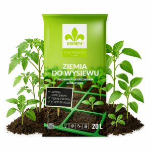 Ziemia do wysiewu i pikowania Kronen o pojemności 20 l to specjalistyczne podłoże przeznaczone do wysiewu nasion, pikowania sadzonek oraz ukorzeniania roślin. Produkt został wyprodukowany na bazie drobnej frakcji torfu wysokiego o różnym stopniu rozkładu. Zawiera glinkę, nawilżacz oraz niewielką ilość nawozu z mikroelementami. Odczyn podłoża utrzymuje się w zakresie pH 6,0–6,8, co odpowiada wymaganiom młodych roślin oraz kultur wrażliwych na zasolenie.