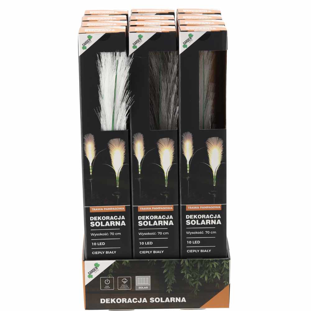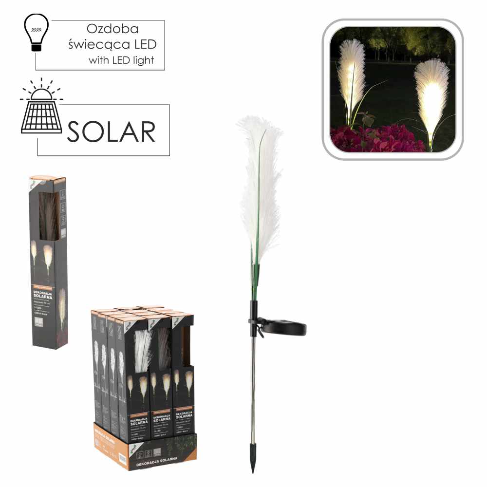 Lampa solarna ogrodowa w formie trawy pampasowej to dekoracyjne oświetlenie przeznaczone do montażu w gruncie. Konstrukcja o wysokości 70cm wyposażona jest w delikatne włókna imitujące naturalną roślinę, które po zmroku są podświetlane przez 10 diod LED.