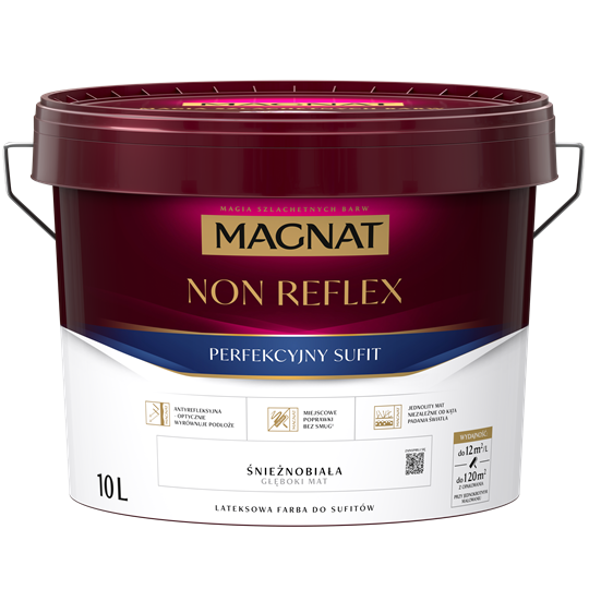 Magnat Non-Reflex to biała farba do sufitów przeznaczona do malowania powierzchni wewnątrz pomieszczeń. Produkt tworzy powłokę o głęboko matowym wykończeniu, która pochłania refleksy świetlne i pomaga optycznie wyrównać pomalowaną powierzchnię.