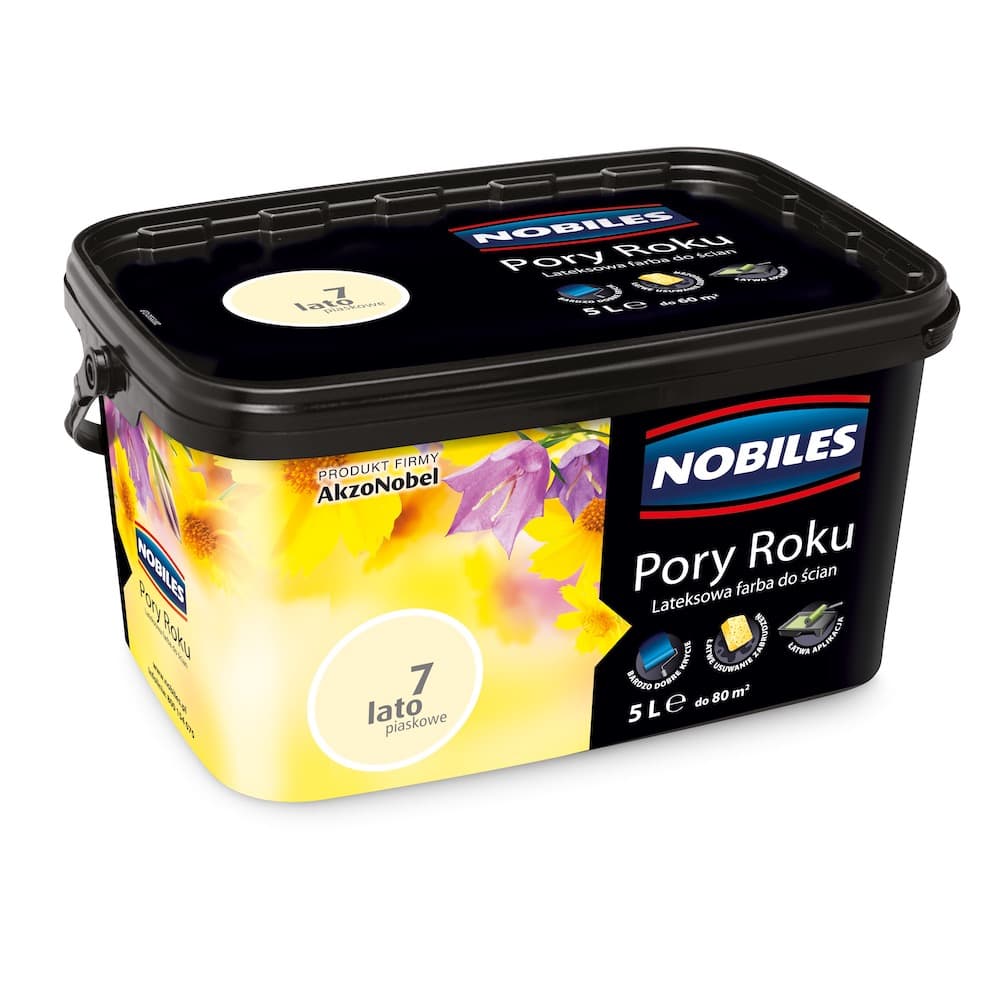 Nobiles Pory Roku lateksowa farba do ścian to kolekcja matowych farb dostępnych w innowacyjnych gamach kolorystycznych, przeznaczonych do dekoracyjnego malowania ścian i sufitów wewnątrz pomieszczeń. Farby z kolekcji Pory Roku tworzą powłoki o wysokich walorach dekoracyjnych, charakteryzujących się doskonałym kryciem, trwałością i czystością barw. Dzięki mikroporowatej strukturze umożliwiają oddychanie ścian. Farby Pory Roku zalecane są do podłoży cementowo-wapiennych, betonowych, gipsowych i kartonowo- gipsowych, również wcześniej malowanych farbami emulsyjnymi. Można zmywać z nich lekkie zabrudzenia.