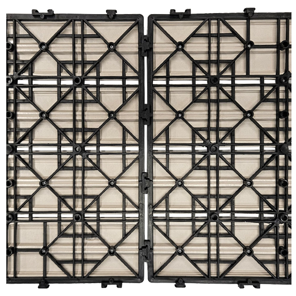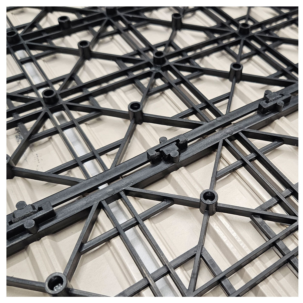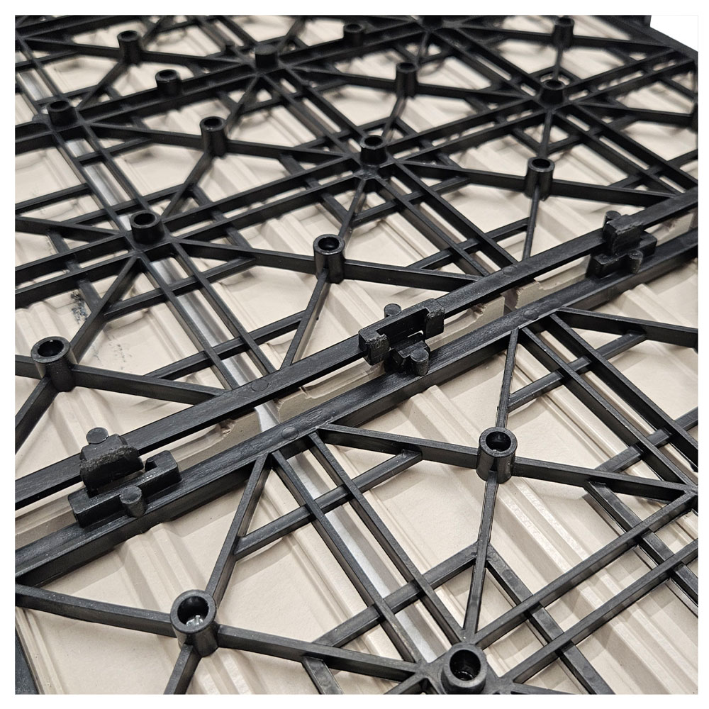Konstrukcja oparta na podstawie drenażowej z kratką montażową umożliwia swobodny przepływ wody pod powierzchnią płytek i zwiększa ich stabilność. Modułowy system zatrzaskowy pozwala na szybkie układanie podłogi bez stosowania narzędzi. W razie potrzeby elementy można łatwo zdemontować lub przyciąć do wymaganego wymiaru, dopasowując je do kształtu tarasu lub balkonu.