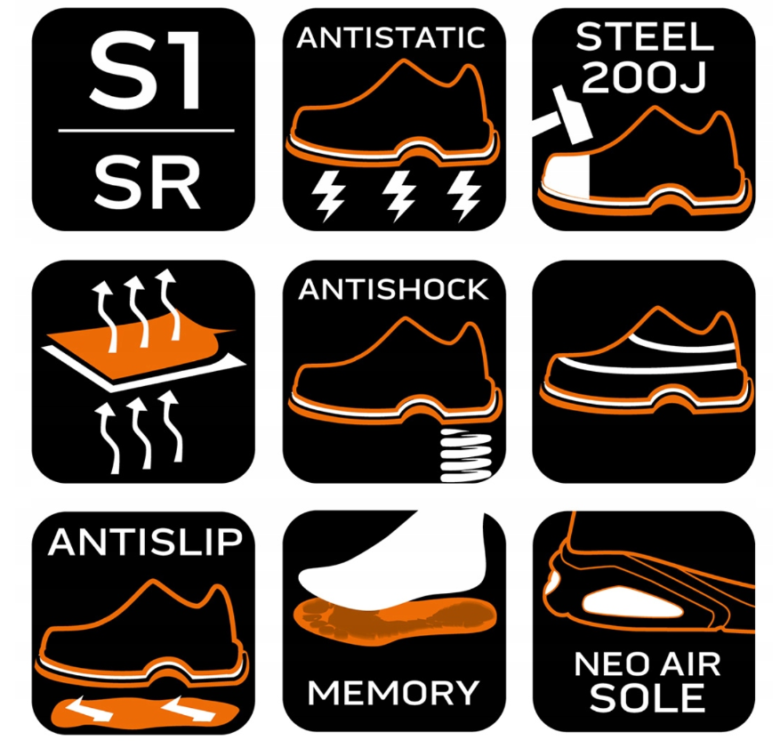 Stalowy podnosek: Buty wyposażone są w stalowy podnosek, który chroni stopy przed uderzeniami z energią równą 200J, co czyni je idealnym wyborem do pracy w wymagających warunkach.