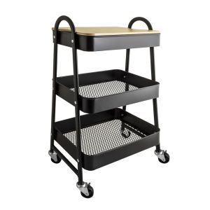 Regał na kółkach wykonany ze stali malowanej na kolor czarny. Posiada blat imitujący naturalne drewno, który równocześnie służy jako pokrywa do płytkiej półki przeznaczonej na drobiazgi. Dodatkowo posiada dwa kosze z ażurowym spodem. Kółka zapewniają mobilność, ale zostały także wyposażone w blokady. Regał wymaga samodzielnego skręcenia.