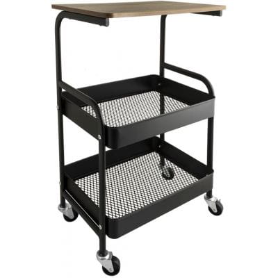 Regał na kółkach wykonany ze stali malowanej na kolor czarny. Posiada funkcjonalny blat imitujący naturalne drewno. Dodatkowo posiada dwa kosze z ażurowym spodem. Kółka zapewniają mobilność, ale zostały także wyposażone w blokady. Regał wymaga samodzielnego skręcenia.