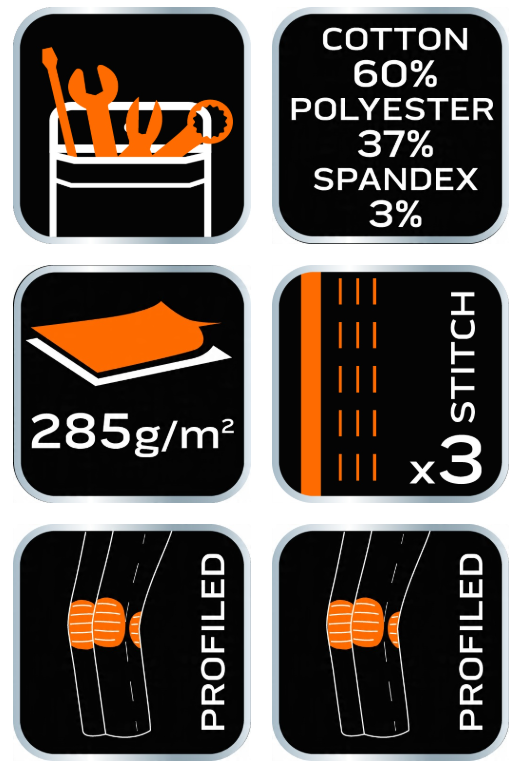 - spodnie robocze z dodatkiem elastanu – lepsze dopasowanie do sylwetki i swoboda ruchów,