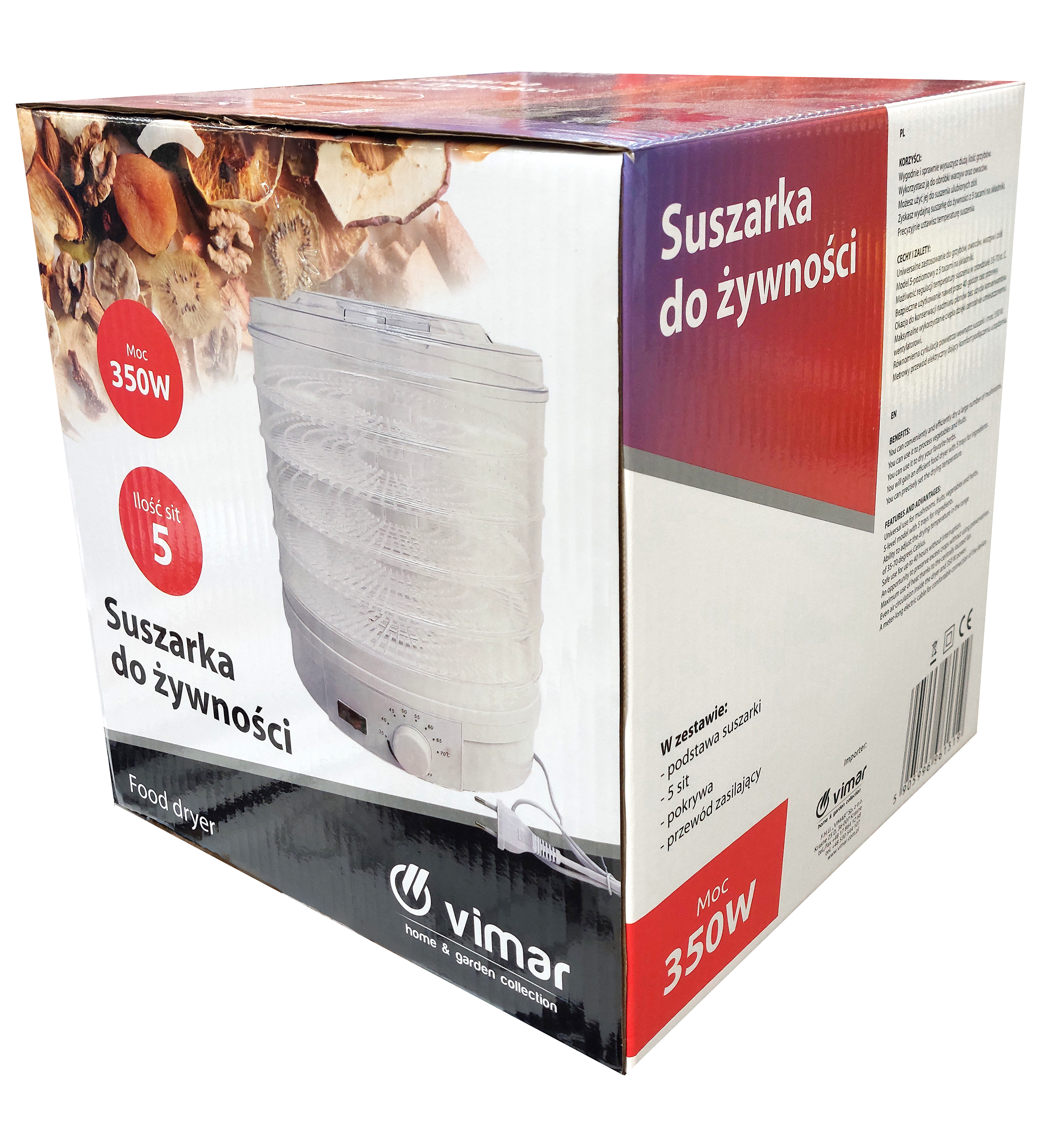 Suszarka do żywności Vimar 350W to praktyczne i niezawodne urządzenie, które pozwala w prosty sposób suszyć owoce, warzywa, grzyby oraz zioła. Dzięki mocy 350 W i regulacji temperatury w zakresie 35–70°C, użytkownik może precyzyjnie dostosować parametry do rodzaju suszonego produktu. Model wyposażony jest w 5 sit, które umożliwiają jednoczesne przygotowanie większej ilości składników.