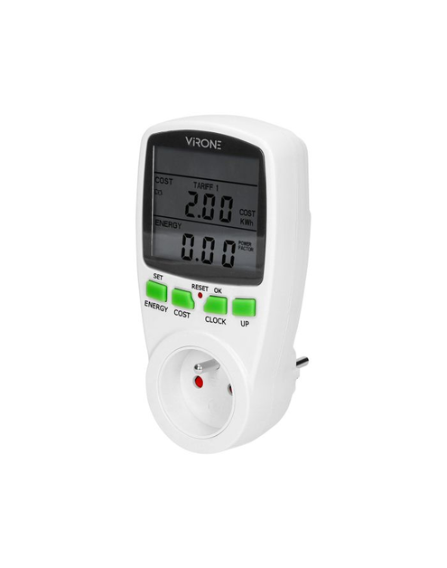 Watomierz umożliwia nam sprawdzenie zużycia prądu elektrycznego i obliczenie kosztów zużytej energii podłączonego urządzenia (2 oddzielne taryfy). Duży wyświetlacz LCD pokazuje dodatkowo aktualny czas, napięcie i natężenie prądu, współczynnik mocy, częstotliwość, maksymalne obciążenie prądu i ostrzeżenie o przeciążeniu, możliwość wprowadzenia 4 rodzajów waluty. Wewnętrzny akumulator: 2 × 1,5V LR44 podtrzymuje ustawienia urządzenia w razie braku prądu.