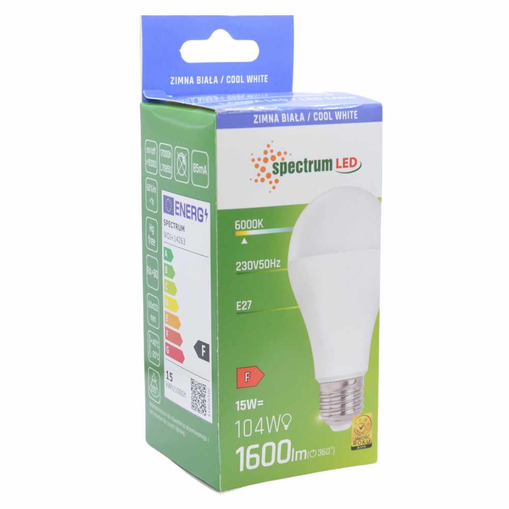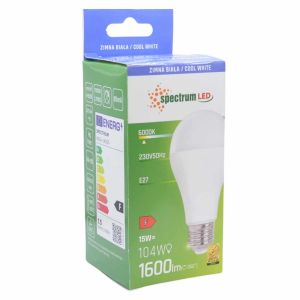 Żarówka LED marki Spectrum LED z trzonkiem E27 i mocą 15 W przeznaczona jest do standardowych opraw oświetleniowych zasilanych napięciem 230 V. Emituje światło o barwie 6000 K, określanej jako zimna biała, oraz strumień świetlny 1600 lm. Konstrukcja umożliwia szeroki kąt świecenia 270°, co pozwala na równomierne rozproszenie światła w pomieszczeniu.