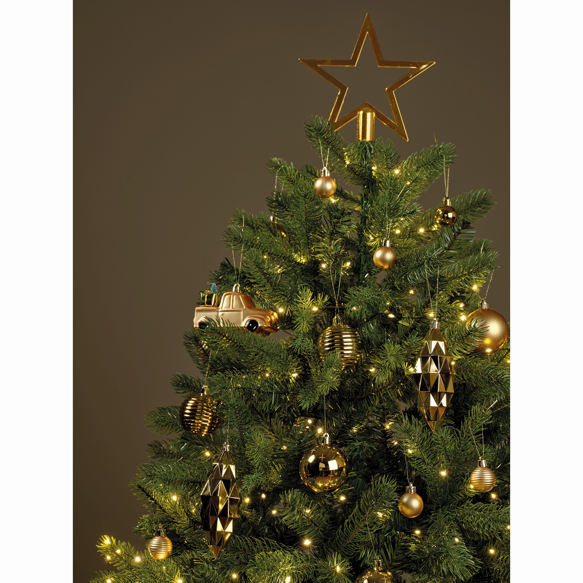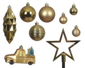 Zestaw bombek polistyrenowych i ozdób. Jasnozłota kolorystyka pozwala na tworzenie jednolitych aranżacji świątecznych w tonacji złota. Bombki są lekkie i nietłukące, co zwiększa bezpieczeństwo użytkowania oraz ułatwia dekorowanie. Produkt posiada nitkę do zawieszenia, a całość zapakowana jest w pudełko o wymiarach 24 × 12 × 23 cm.
