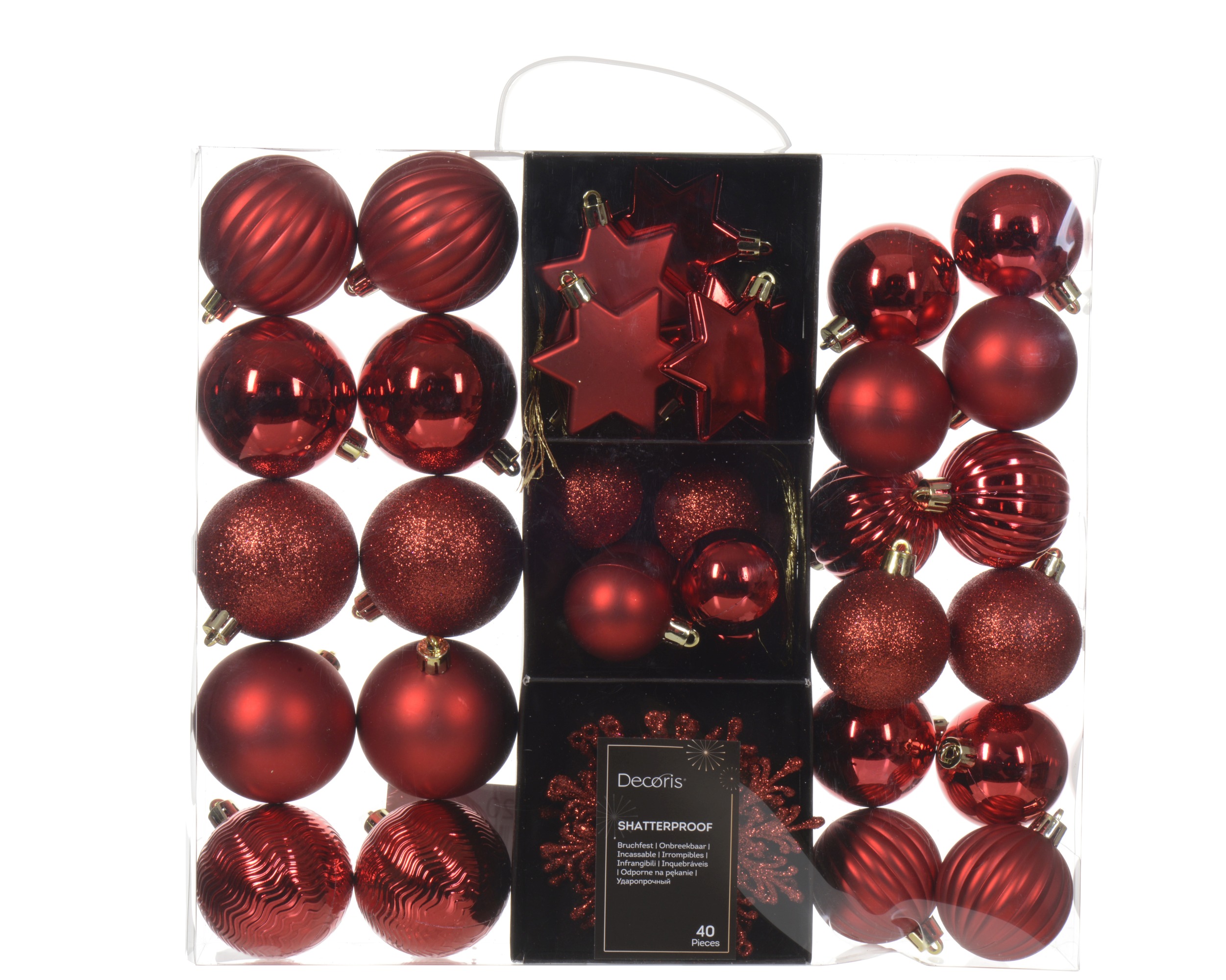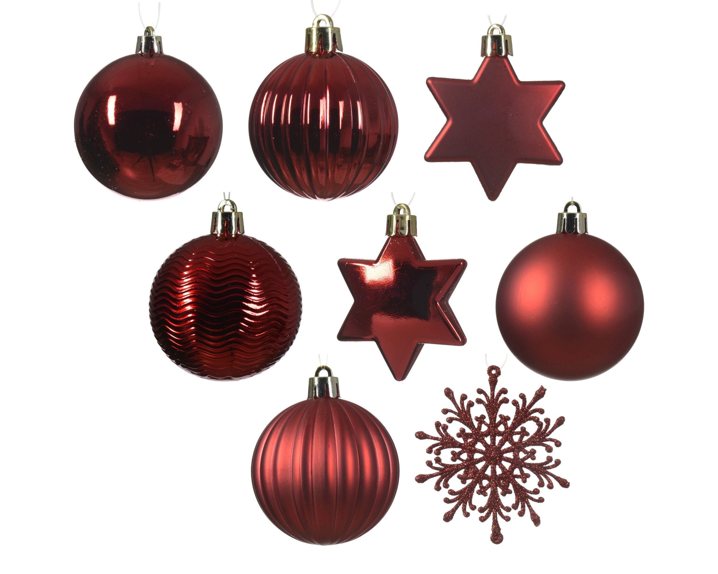 W komplecie znajdują się bombki i zawieszki w różnych wykończeniach : błyszczącym, matowym, brokatowym oraz formowanym. Kolor czerwony świąteczny wpisuje się w tradycyjną paletę bożonarodzeniową. Zestaw obejmuje bombki o zróżnicowanych fakturach, ozdobne elementy formowane oraz płaskie zawieszki w kształcie płatków śniegu i gwiazd. Ozdoby posiadają złote czapki typu PS Cap oraz drut do zawieszenia. Całość zapakowana jest w opakowanie Transbox a 40.