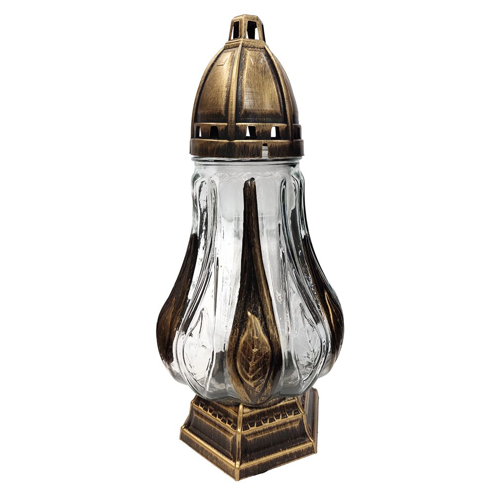 Znicz szklany Flavia Mała 32 cm to elegancki model wykonany z grubego szkła z dekoracyjnymi zdobieniami w kolorze starego złota. Wyposażony w trwały wkład parafinowy, zapewnia długotrwałe i równomierne spalanie. Klasyczna forma i solidna podstawa sprawiają, że doskonale prezentuje się na każdym nagrobku.