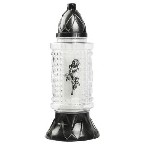 Znicz szklany Z-217 to klasyczny model przeznaczony na groby całoroczne. Wykonany ze szkła z dekoracyjnym tłoczeniem i metalizowanym motywem róży, osadzony na stabilnej plastikowej podstawce z dopasowanym kapturkiem. W zestawie znajduje się parafinowy wkład, dzięki czemu znicz jest gotowy do użycia.