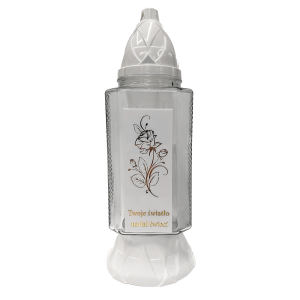 Znicz szklany Z-552 to stylowy znicz o wysokości 30 cm, wykonany z grubego szkła i trwałego tworzywa sztucznego. Posiada przezroczysty klosz z subtelnymi złotymi akcentami oraz wymienny wkład parafinowy. Dzięki klasycznemu wyglądowi i solidnej konstrukcji doskonale sprawdza się jako trwała ozdoba nagrobka.